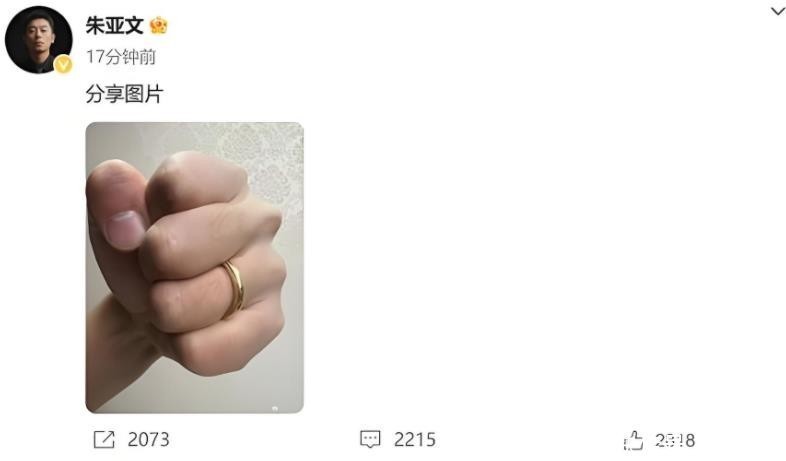 而且就在工作人员否认离婚说法后,朱亚文又在微博上晒出一张照片,照片里的朱亚文戴着婚戒,表示他与沈佳妮的婚姻没有任何问题。